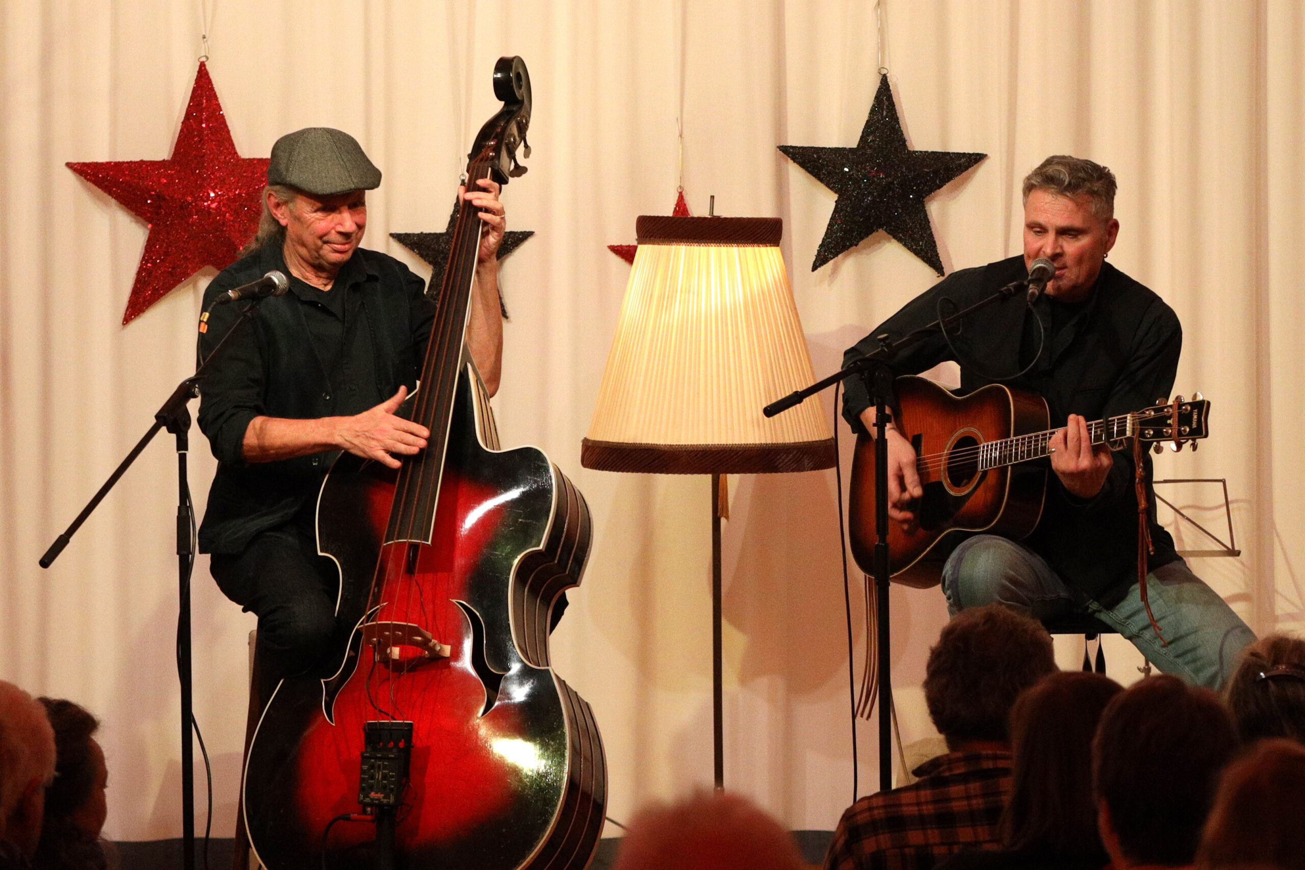 „Das war ein Kulturjahrauftakt bei uns in der AWO, wie wir ihn uns nicht besser hätten vorstellen können“, so Peter Zwilling, Vorsitzender der Wülfrather AWO. Mit 110 Zuschauern war der große Saal der AWO so gut wie ausverkauft.Das bergisch-sauerländische Duo Jo Heinemann und Rolf Kaudelka begeisterten die Zuschauer mit zumeist amerikanischen Hits aus den 50er und 60er und 70er Jahren von den Everly Brothers über Buddy Holly bis Elvis Presley. In dem musikalischen Reigen durfte der Boss, Bruce Springssteen, nicht fehlen.Die HeartDevils nahmen ihr Publikum mit in die Geschichte der Songs und erzählten über ihre eigenen Erlebnisse mit der Musik. „Nach dem ich als Kind zum ersten Mal die Everly Brothers hörte, war meine Zeit als Luftgitarrist vorüber und ich lernte Gitarre. Die liebe zu dieser Musik hat mich und mein Spiel geprägt“, erzählt Gitarrist Rolf Kaudelka.Jo Heinemann am Kontrabass unterstützt die Gitarre so phänomenal und gleichzeitig zurückhaltend, dass die Zuschauer den Eindruck haben die Originale zu hören und nichts an Instrumentalisierung vermissen. (Supertipp Wülfrath)